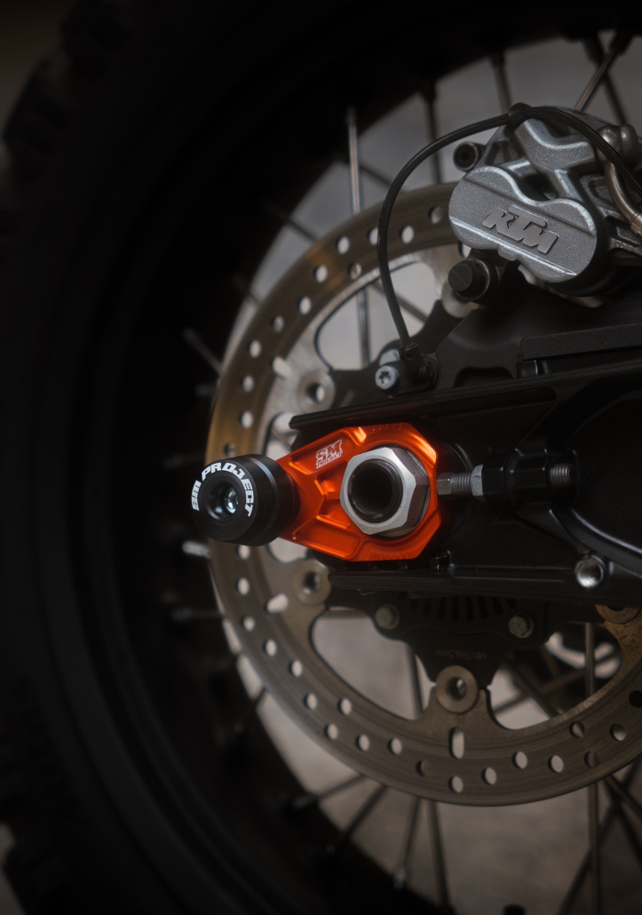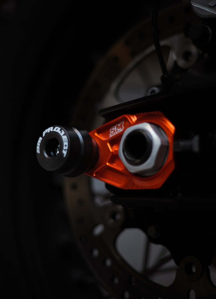 Entdecken Sie unsere neuen exklusiven Kettenspannerregister mit integrierten Schiebern, das Ergebnis akribischer Designforschung, präzise gefertigt mit CNC-Präzision, um jedes Oberflächendetail hervorzuheben. Dieses Kit verleiht nicht nur eine stilvolle Note, sondern bietet auch zuverlässigen Schutz für die Schwinge und die Radachse im Falle eines Sturzes, um mögliche Schäden zu minimieren