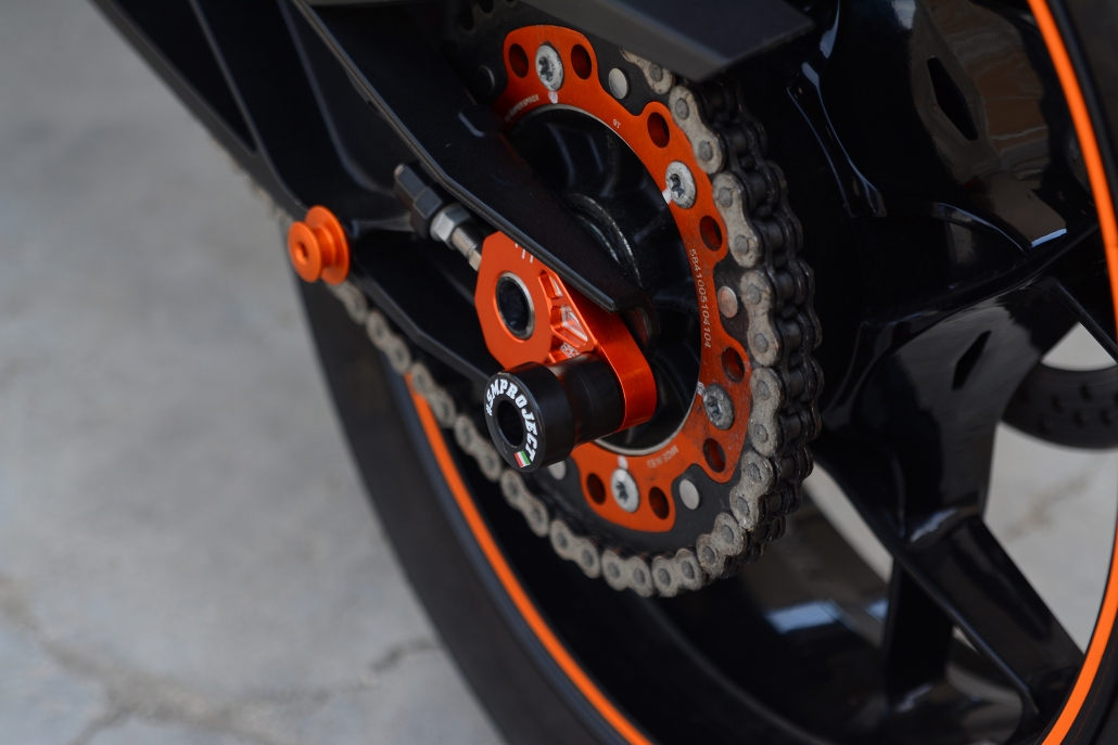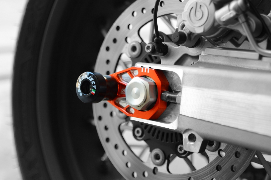 Kit registri tendicatena con slider integrato. Proteggono il forcellone/dado/perno in caso di caduta